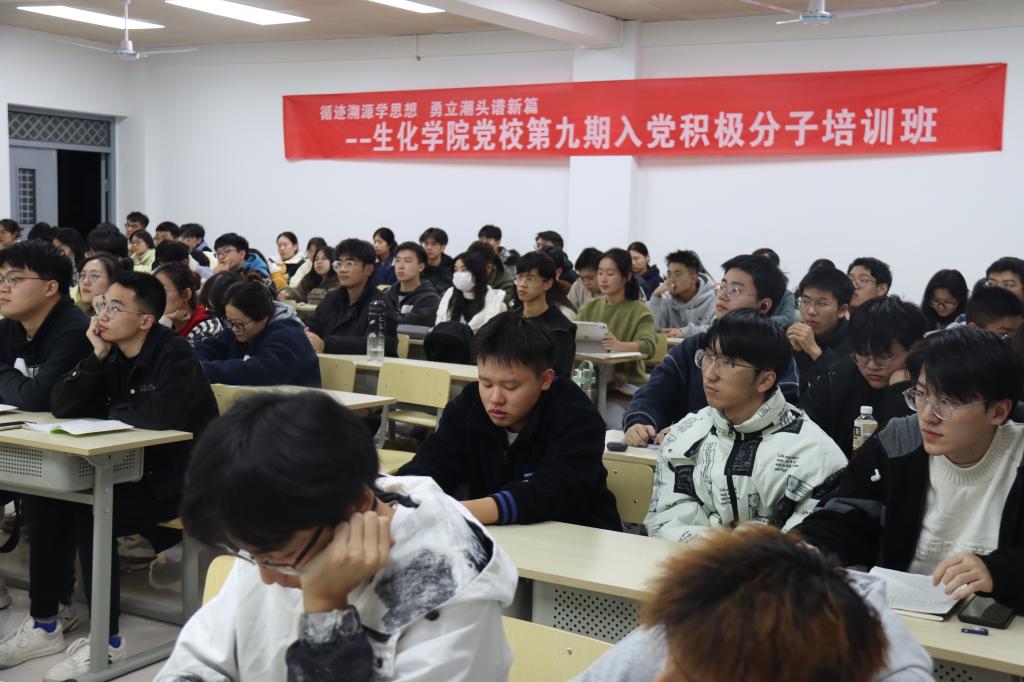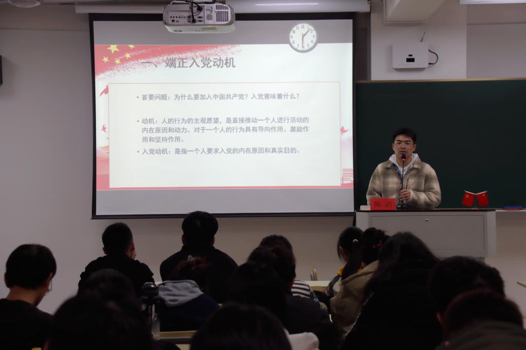 11月24日18:00,学院党校第九期入党积极分子培训班第五课在A2-418进行,学院学工办主任、化工专升本党支部书记陈滔老师围绕“大学生怎样争做一名合格的共产党员”主题讲授专题党课,百余名学员参加了学习。