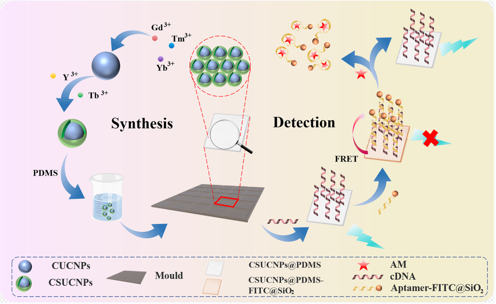 上转换纳米传感方法是一种新兴的检测方法并受到了广泛的关注。上转换纳米材料由稀土掺杂的无机材料组成,具有将近红外光转换为紫外或可见光的独特能力。它具有高光稳定性、自荧光干扰小、低细胞毒性和可调谐的发射特性已成为检测食品中有害物质的优势方法。因此,本研究提出了一种利用上转换纳米材料为发光供体,以聚二甲氧基硅烷为基质固态发光传感器。将核壳上转换的纳米粒子均匀封装在聚二甲氧基硅烷薄膜中;然后用丙烯酰胺适配体的互补链对其进行修饰。将纳米化异硫氰酸荧光素与适配体偶联,附着在聚二甲氧基硅烷薄膜表面并通过荧光共振能量转移有效地猝灭上转换发光。丙烯酰胺的引入会优先与适配体结合,猝灭剂与供体分离,导致发光恢复。该传感器可用于光谱和发光图像的双指标检测,检测限分别为1.00 nM和 1.07 nM。在实际的食品检测中,本方法表现出良好的准确性,具有实现现场化检测的潜力。