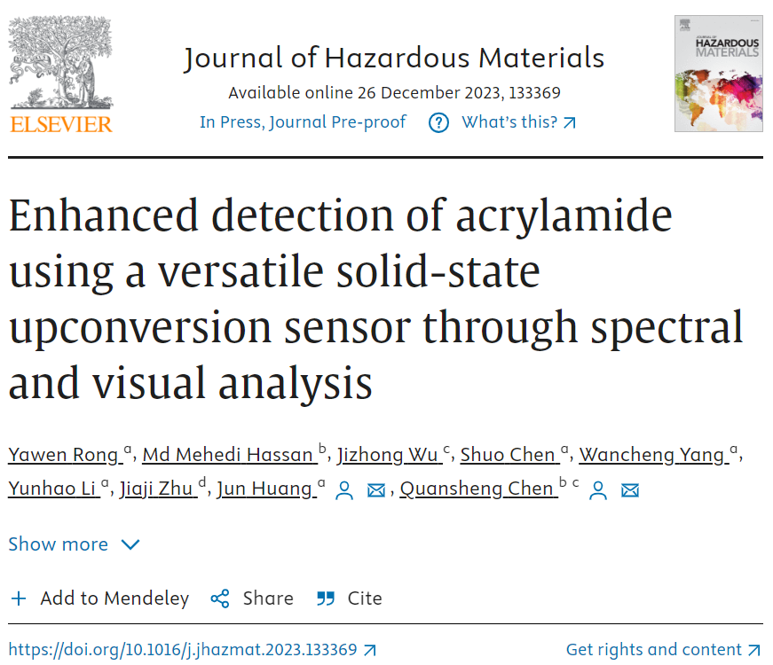 近日,生物催化与分子诊断团队在国际环境科学与生态学顶级刊物《Journal of Hazardous Materials》(IF=13.6)以第一单位发表了题为“Enhanced detection of acrylamide using a versatile solid-state upconversion sensor through spectral and visual analysis”的研究论文(https://doi.org/10.1016/j.jhazmat.2023.133369)。该工作由williamhill体育中文黄俊教授课题组、集美大学陈全胜教授课题组合作完成,荣雅文博士为论文第一作者。