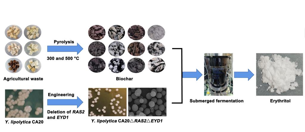 近年来,天然甜味剂赤藓糖醇凭借肠道耐受性好、低热值和不改变血糖浓度等特性而受到食品及医药行业的广泛关注,市场需求量快速上升。赤藓糖醇主要由解脂亚罗酵母(Yarrowia lipolytica)以葡萄糖为底物进行高渗发酵制备。解脂亚罗酵母是一种二型性酵母,在环境胁迫下会形成假菌丝,而假菌丝的形成通常会抑制赤藓糖醇合成,制约赤藓糖醇发酵生产。针对该问题,研究团队首先通过转录组分析揭示了假菌丝细胞合成赤藓糖醇受抑的分子机制。在此基础上,通过敲除基因RAS2抑制假菌丝形成,并进一步敲除EYD1促进细胞合成赤藓糖醇。此外,研究首次证实在液态发酵体系中加入生物质碳可显著提升赤藓糖醇发酵水平。最终,研究构建的解脂亚罗酵母CA20∆RAS2∆EYD1在96h内可合成220.20 ± 10 g/L赤藓糖醇。研究结果为定向选育高产菌株和提高赤藓糖醇发酵水平提供了新思路。