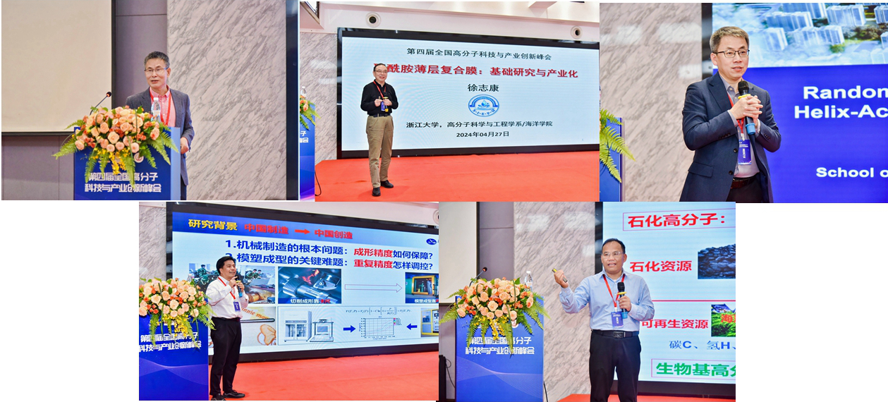 南方科技大学陈忠仁教授、浙江大学徐志康教授、西湖大学程建军教授、北京化工大学杨卫民教授、中国科学院宁波所朱锦研究员,分别以《高分子物理指导下的化工新材料研究--从催化体系、聚合反应到加工工艺、性能调控》《聚酰胺薄层复合分离膜:基础研究与产业化》《多肽材料的可控合成和生物学应用》《高分子材料成型加工与低碳绿色智能制造技术创新研究进展》和《生物基高分子材料研究新进展》为主题作了大会邀请报告,精彩纷呈,反响热烈。