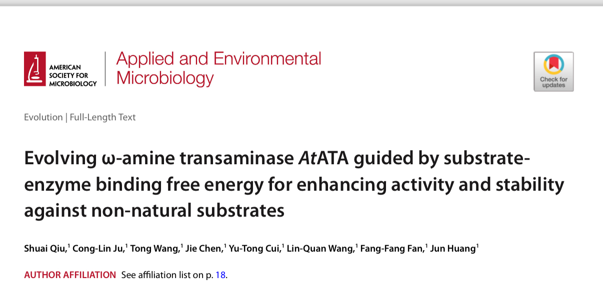 近日,生物催化与分子诊断团队以williamhill体育中文为唯一单位在微生物学领域权威期刊Applied and Environmental Microbiology上在线发表题为“Evolving ω-amine transaminase AtATA guided by substrate-enzyme binding free energy for enhancing activity and stability against non-natural substrates”的研究性论文。我校青年教师邱帅博士为论文第一作者,黄俊教授为论文通讯作者。该研究得到了国家自然科学基金(32201037,32071268)和浙江省高层次人才特殊支持计划项目(2022R52024)的支持。樊芳芳副教授对本工作的理论模拟部分提供大力指导。