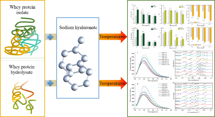 透明质酸在食品中的应用日益广泛,其钠盐已被批准添加至乳制品、饮料等食品中,因此其与食品组分的相互作用也日益受到关注。课题组从结构上证实了透明质酸及其钠盐和乳蛋白的结合,研究了不同处理手段下两者的相互作用,发现透明质酸及其钠盐的结合不仅影响乳蛋白的结构和理化性质,还能改变乳蛋白的功能特性,如消化性、致敏性、铁结合能力等。研究结果为拓展透明质酸及其钠盐在乳制品中的应用提供了借鉴。