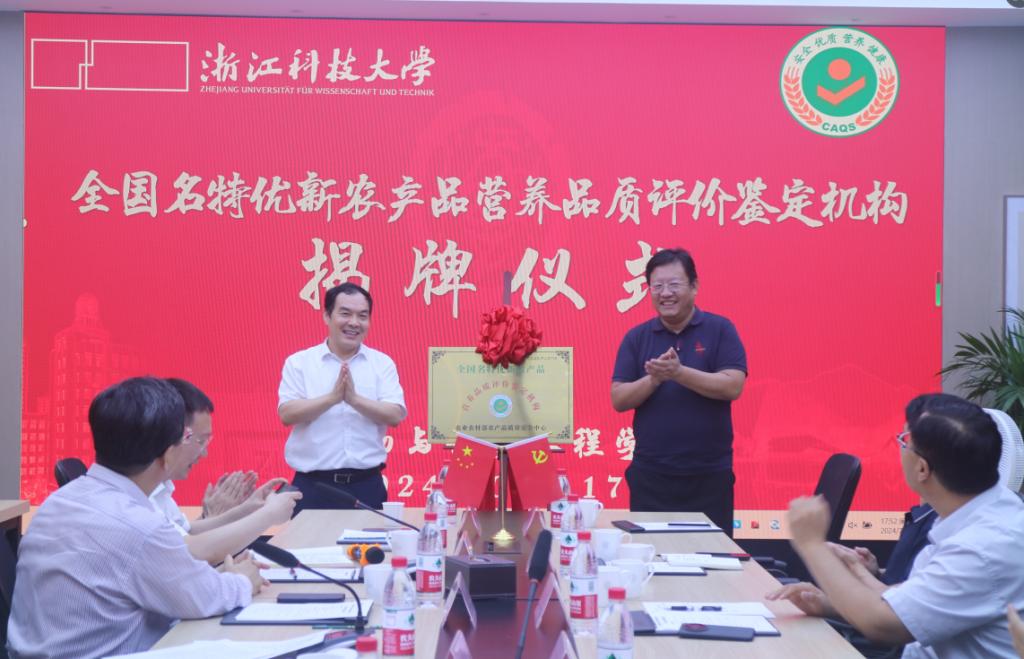 2024年7月17日,农业农村部农产品质量安全中心王子强副主任和优质农产品发展处处长一行到我校调研全国名特优新农产品营养品质评价鉴定工作,浙江省农业农村厅二级巡视员费建庆、浙江省农产品绿色发展中心主任章颖逸等陪同调研。我校梁荣华副校长对王子强副主任一行表示热烈欢迎,并向调研组介绍了我校学科发展现状,梁荣华副校长表示我校将对全国名特优新农产品营养品质评价鉴定工作从人员配置和硬件提升进行全面支持。调研会上,王子强副主任与梁校长共同为“全国名特优新农产品营养品质评价鉴定机构”揭牌。