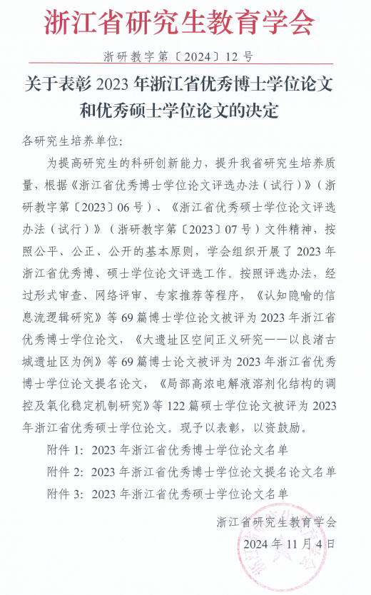 11月4日,浙江省研究生教育学会发布《关于表彰2023年浙江省优秀博士学位论文和优秀硕士学位论文的决定》,我院龚金炎教授和宋恭帅副教授指导的化学工程与技术2023届毕业生刘家源硕士学位论文《超声效应对β-乳球蛋白和绿原酸复合物的形成及其包埋姜黄素的机制研究》获评“浙江省优秀学位论文”。