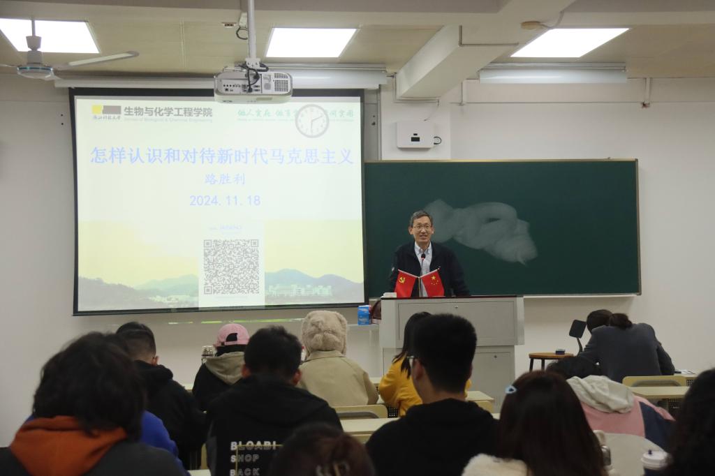 路胜利教授以“怎么认识和对待新时代马克思主义?”为题,从“时代背景、主要内容、发展历程、当代价值、正确对待”五个方面,对马克思主义进行了深入讲解,引导在场师生深入思考如何正确认识和对待新时代马克思主义思想和历史地位。他指出,认识马克思主义首先要了解时代背景,马克思主义就是马克思对所处的时代和世界的深入考察,对人类社会发展规律的深刻把握。