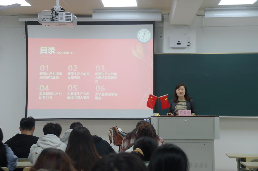 11月25日18:00,学院党校第十期入党积极分子培训班第六课在A2-422进行,学院党委委员蔡素燕老师围绕“如何认识发展新质生产力”主题讲授专题党课,九十余名学员现场参加了学习。