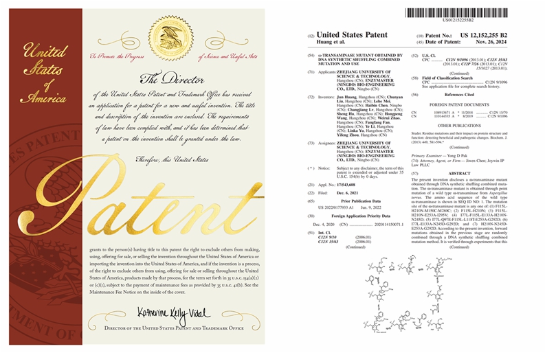 近日,生物催化与分子诊断团队申报的“ω-transaminase mutant obtained by DNA synthetic shuffling combined mutation and use”(一种通过DNA合成改组组合突变获得的ω-转氨酶突变体及应用)在美国获得了专利授权,这一成果标志着团队首次通过国际PCT途径获得美国发明专利授权(授权号:US12152255B2),相关的研发成果已经得到了国际上的认可。
