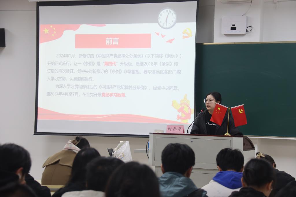 11月27日18:00,学院党校第十期入党积极分子培训班第八课在A2-422进行,生物工程专业学生党支部书记叶苗苗老师围绕“学习《中国共产党纪律处分条例》(以下简称《条例》)-强化党性修养,锤炼过硬本领”主题讲授专题党课,九十余名学员现场参加了学习。