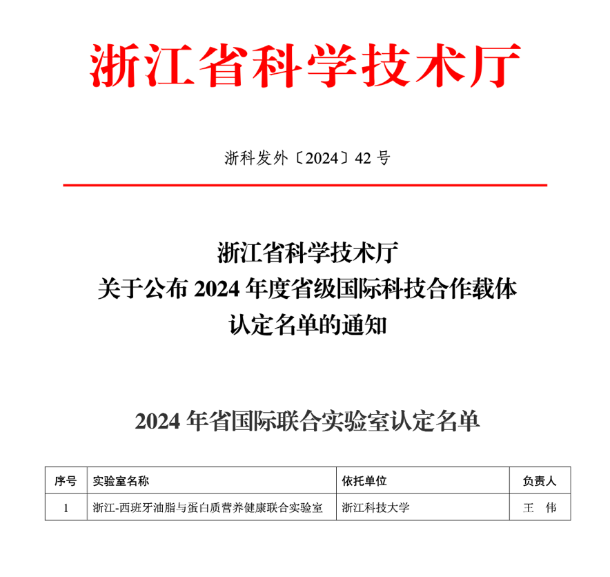 近日,浙江省科学技术厅下达了《关于公布2024年度省级国际科技合作载体认定名单的通知》,由williamhill体育中文williamhill中国王伟研究员牵头申报的“浙江-西班牙油脂与蛋白质营养健康联合实验室”被认定为2024年度省级国际科技合作载体。这一认定标志着williamhill体育中文生化学院在国际合作与技术创新领域取得了新的突破。
