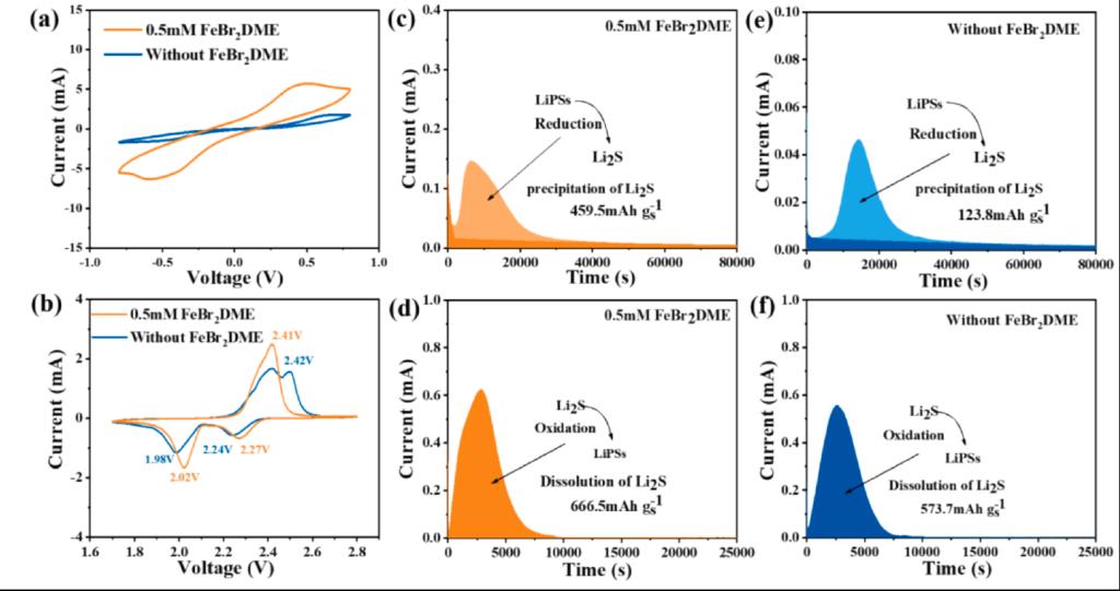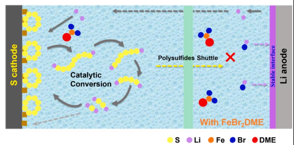 研究团队经过精心筛选和研究,发掘了一种新型电解质添加剂--FeBr2DME。这一创新性添加剂在锂硫电池中展现出了双重功能:它不仅能催化多硫化物的转化,加速反应动力学,还能有效稳定锂沉积,从而大幅提升电池的性能。