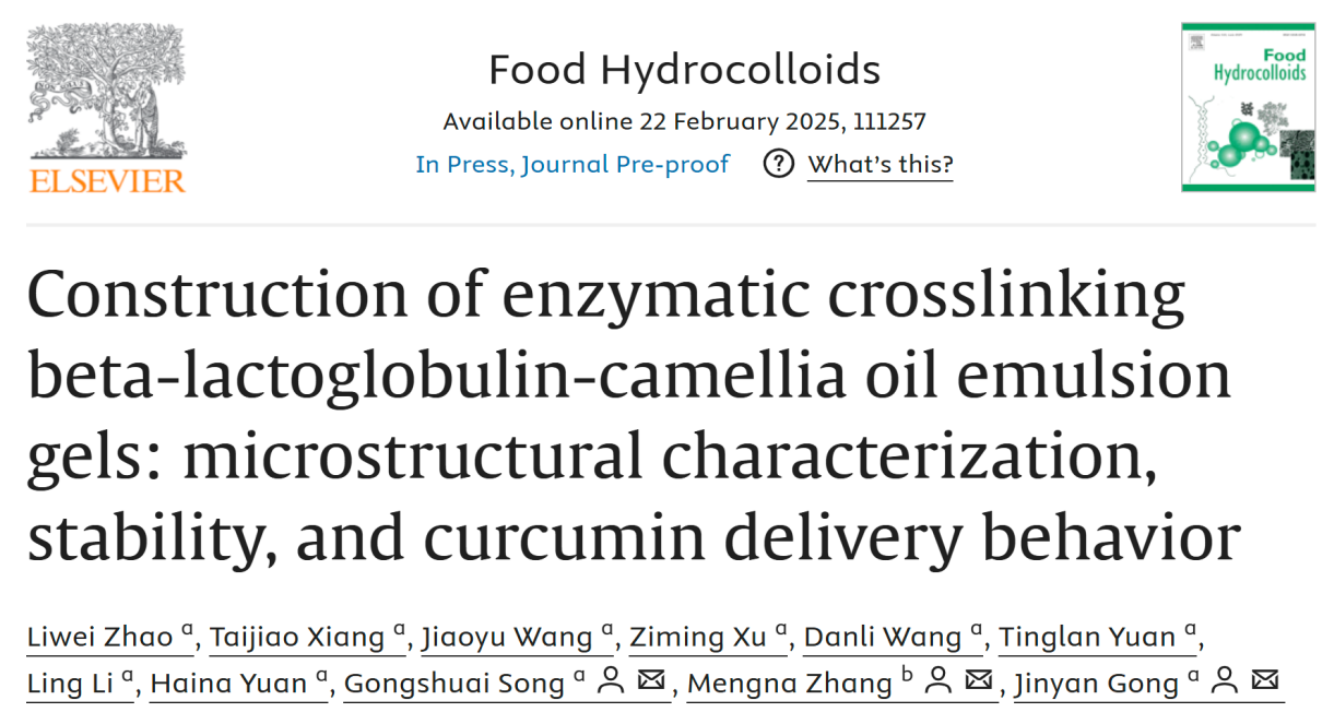 近日,我院食品科学与工程专业2022级本科生赵李维同学在功能食品与乳制品加工创制团队老师的指导下,以第一作者在食品领域权威期刊Food Hydrocolloids(IF 11.0,SCI一区)发表题为“Construction of enzymatic crosslinking beta-lactoglobulin-camellia oil emulsion gels: microstructural characterization, stability, and curcumin delivery behavior”(https://doi.org/10.1016/j.foodhyd.2025.111257)的研究论文。该论文依托国家自然科学基金(32302223、32372469和31871763)和国家级大学生创新创业训练计划项目(202411057030),主要研究基于转谷氨酰胺酶交联的乳蛋白加工及营养体系构建机制,龚金炎教授与宋恭帅博士为共同通讯作者。
