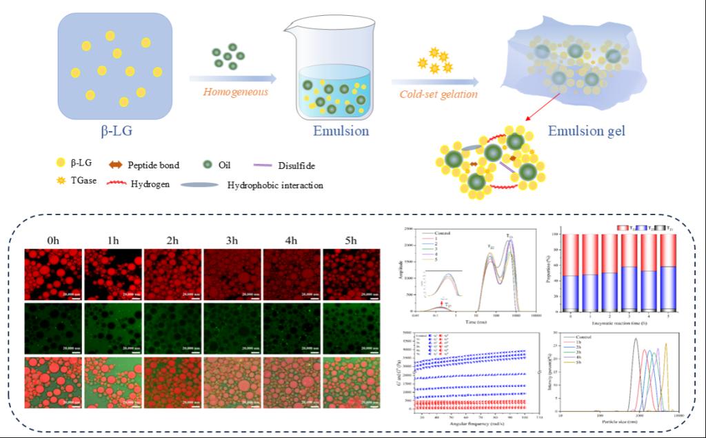 山茶籽油(CAO)是一种优质的植物油,富含不饱和脂肪酸,但在加工和储存过程中容易氧化变质。基于蛋白质的凝胶化可有效保护油脂不被氧化。β-乳球蛋白(β-LG)是一种常见的蛋白质,具有良好的乳化、凝胶等特性。转谷氨酰胺酶(TG)可诱导蛋白质避免热处理,在温和条件下形成凝胶。本研究证实了TG诱导催化β-LG-CAO乳液凝胶具有输送不饱和脂质以及其他不稳定营养物质和生物活性物质的潜力,研究成果可为功能因子高效稳定的食品级递送系统和功能性食品的开发利用提供科学依据和理论指导。