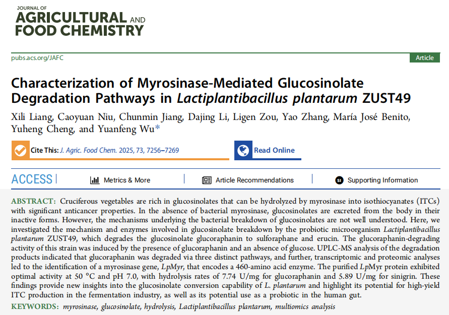 近日,学院天然产物与营养健康团队在国际高水平期刊Journal of Agricultural and Food Chemistry上发表题为“Characterization of Myrosinase-Mediated Glucosinolate Degradation Pathways in Lactiplantibacillus plantarum ZUST49”的封面论文(点击阅读),梁喜丽博士为论文第一作者,吴元锋教授为通讯作者,williamhill体育中文为第一单位。
