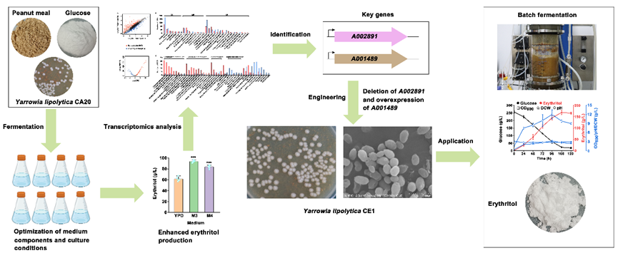 近年来,天然甜味剂赤藓糖醇凭借肠道耐受性好、低热值和不改变血糖浓度等特性而受到食品及医药行业的广泛关注,市场需求量快速上升。目前,赤藓糖醇主要由解脂亚罗酵母(Yarrowia lipolytica)以葡萄糖为底物进行高渗发酵制备,生产成本较高。为降低生产成本,研究团队成功创制了利用花生粕和葡萄糖发酵合成赤藓糖醇的方法。通过发酵条件优化和代谢工程改造,构建的菌株解脂亚罗酵母CE1可以在108 h内合成178.78 g/L赤藓糖醇,得率高达0.78 g/g。利用花生粕替代传统发酵过程中使用的氮源,可以降低赤藓糖醇生产成本25%以上。同时,研究成功实现了废弃物花生粕的高价值利用。此外,研究揭示了解脂亚罗酵母适应花生粕培养基的分子机制,成功挖掘关键基因A001489和A002891。研究结果为定向选育高产菌株和提高赤藓糖醇发酵水平提供了新思路。