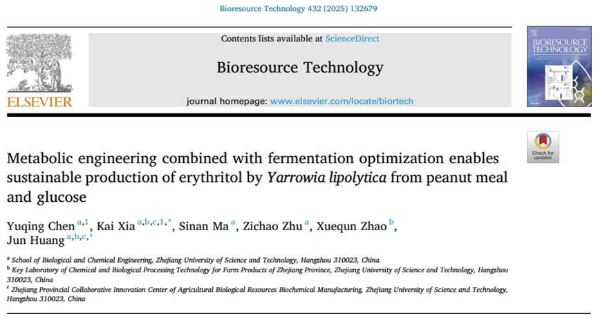 近日,生物催化与分子诊断团队以williamhill体育中文为第一单位在生物资源领域权威期刊Bioresource Technology上在线发表题为“Metabolic engineering combined with fermentation optimization enables sustainable production of erythritol by Yarrowia lipolytica from peanut meal and glucose”的论文。2022级硕士研究生陈雨晴为该论文第一作者,黄俊教授和夏凯博士为论文通讯作者。该研究受到浙江省高层次人才特殊支持计划项目(2022R52024)、浙江省教育厅一般科研项目(Y202351798)和williamhill体育中文科研启动项目资助。