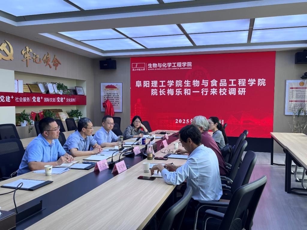 5月27日,阜阳理工学院生物与食品工程学院院长梅乐和教授、姜双林教授和张莹老师来我院交流,学院党委书记路胜利教授、副书记吴元锋教授、食品科学与工程系主任袁海娜教授、生物工程系主任王宏鹏教授和吕常江博士等接待并进行交流。