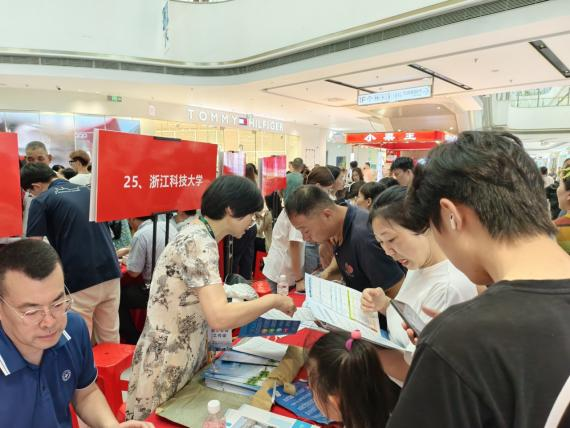 6月28日,朱春凤、余欣两位老师在金华永康万达广场招生宣传咨询现场,为前来咨询的考生、家长解答志愿填报疑问,介绍学校报考情况。