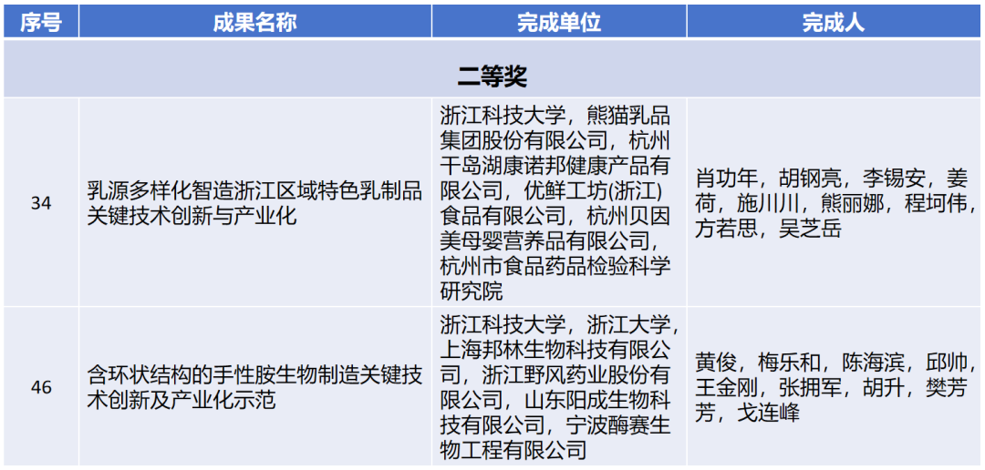 肖功年教授牵头完成的“乳源多样化智造浙江区域特色乳制品关键技术创新与产业化”项目,立足浙江乳源匮乏的产业痛点,联合熊猫乳品集团等行业龙头企业与科研机构,创新构建“投资家+科技家+企业家”协同创新模式。项目以乳品再制新乳品为技术路径,实现炼乳、调制乳粉产品升级,革新新型再制干酪工艺并成功产业化。经鉴定,整体技术达到国际先进水平,再制干酪定向酶解、炼乳精准改性、调制乳粉益生菌保活等核心技术达到国际领先,为浙江乳制品产业高质量发展提供关键技术支撑。