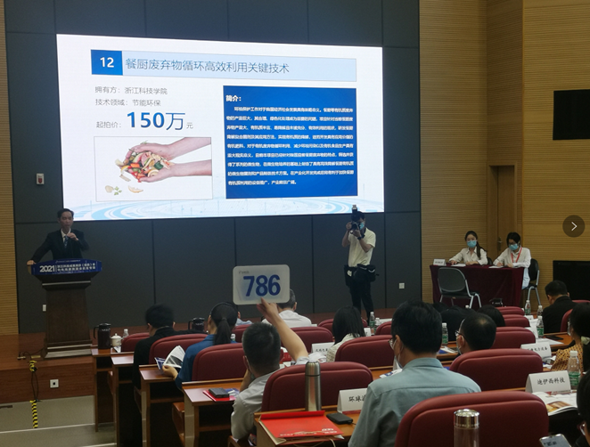 拍卖会上,共有15项标的参与竞拍,涵盖先进制造、节能环保、生命健康、农业农林等热门技术领域的科技成果,总起拍价1508万元,总成交价2140万元。其中,我院蔡成岗博士开发的“餐厨废弃物循环高效利用关键技术”参加拍卖,该成果起拍价150万元,经过竞拍最终以200万元成交。