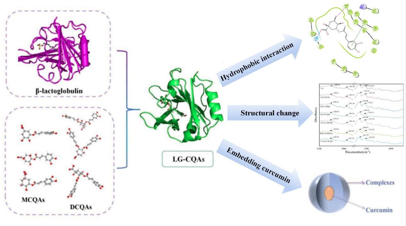 课题组研究生刘家源利用超声波技术构建了β-乳球蛋白和咖啡酰奎宁酸类物质的共价/非共价复合物。并利用多光谱检测和分子对接技术系统地探讨了超声波技术对 β-乳球蛋白和咖啡酰奎宁酸的结合机制的影响,以及包埋姜黄素的潜在生物功能,为蛋白-多酚复合物的开发和应用提供新的见解。