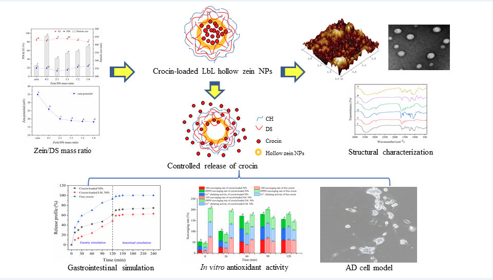 由龚金炎教授带领的功能食品与乳制品加工创新团队长期从事超声加工和食品营养素递送的研究。课题组宋恭帅博士通过层层自组装(LbL)技术制备负载藏红花素的中空硫酸葡聚糖/壳聚糖(DS/CH)包覆玉米醇溶蛋白纳米颗粒,开发了一种潜在的阿尔茨海默病(AD)有效治疗方法的递送体系,并为高效递送生物活性成分提供一种新的实用技术。