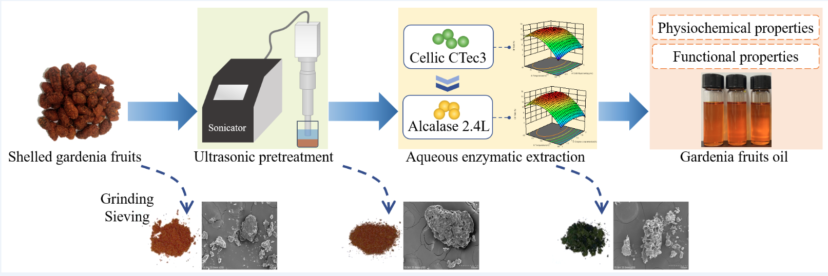 课题组王丹丽博士系统研究了超声波对咖啡酰奎宁酸(3-CQA/4-CQA/5-CQA)降解、转化规律的影响及作用机制,并通过添加剂的引入达到保护咖啡酰奎宁酸的目的。另外,王丹丽博士基于超声波技术建立了超声预处理结合分步水酶法提取栀子油的新方法,极大地提高了栀子油的提取率。同时阐明了超声预处理促进水酶法提取的机理并建立了最优的酶解体系,对产品油的品质分析也证实了超声预处理辅助水酶法的可靠性。