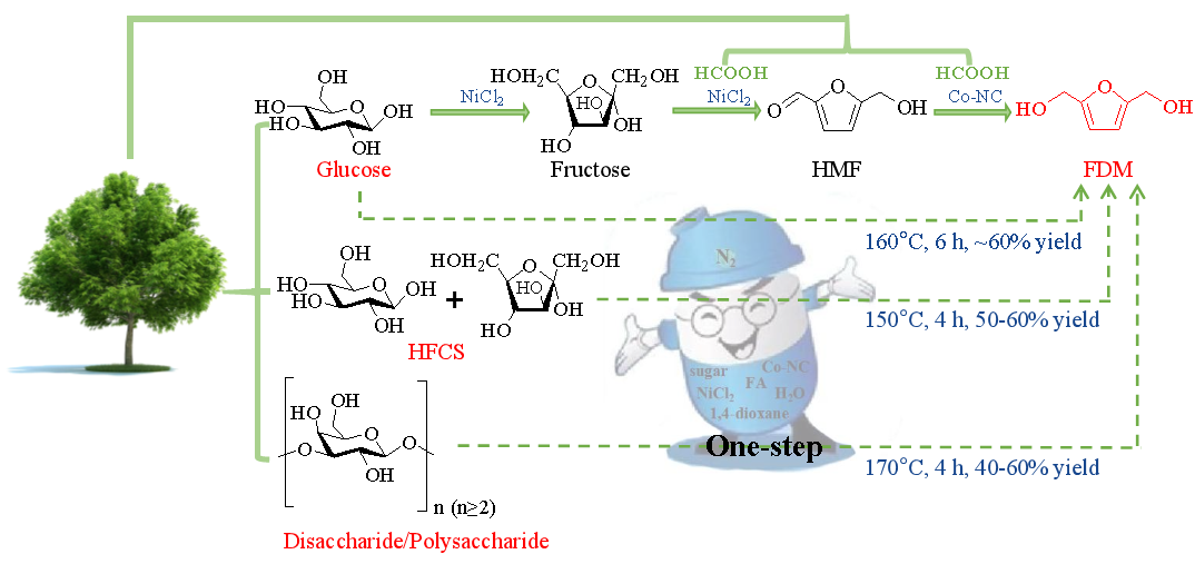 针对以上问题,该研究工作以绿色可再生的甲酸为Brønsted酸和氢供体、非贵金属Co-NC为氢转移催化剂,构建了一类生物质单/多糖一锅制备FDM的催化体系(NiCl2/FA/Co-NC),实现了FDM的一锅法高效选择性制备。该方法具有操作安全、原料可再生、中间物无需分离、原子经济性高等优点。Co-NC催化剂具有良好的稳定性,不仅适用于葡萄糖的一锅转化,还可拓展至工业级高果糖浆、二糖及多糖为原料直接制备FDM。该工作可为生物质多步耦合催化体系的构筑、生物质的高值化催化转化提供新途径。(徐玲)