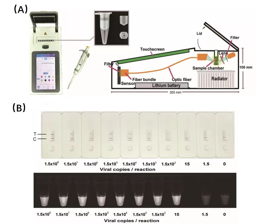 图1. MULAN技术与便携式检测设备(A)、检测试纸及蓝光照射(B)结合