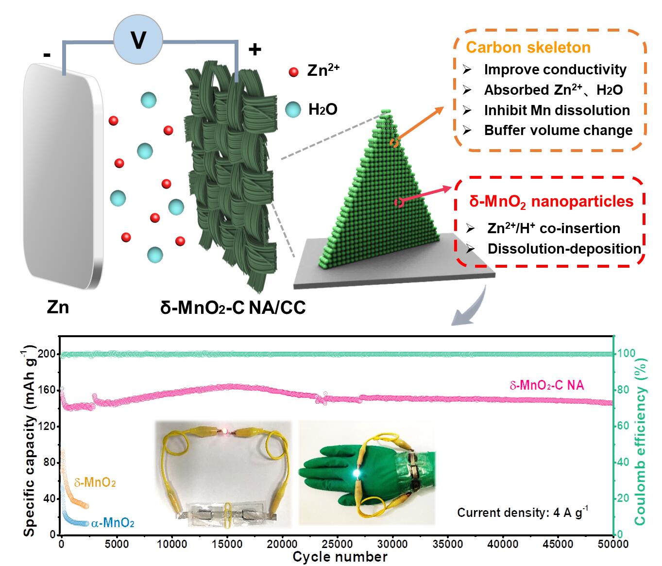 图2.δ-MnO2-C NA/CC电极结构优势示意图、循环性能图及点亮LED灯照片