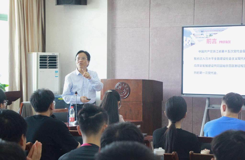 毛建卫领学了省第十五次党代会报告。以许多生动鲜活的案例和同学们一起回顾了过去五年浙江取得的9个方面历史成就和8个规律性认识,他勉励同学们作为未来的应用型工程师应当关注产业经济发展,了解工科教育发展,这样才能立足行业发展,找到个人的成长发展目标;作为一名新时代大学生应当关注浙江文化建设成就,将浙江文化、浙江精神融入血脉,这样才能更好地为“两个先行”奋斗征程贡献力量。