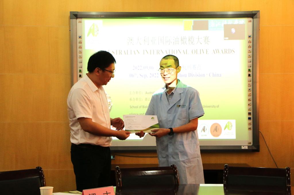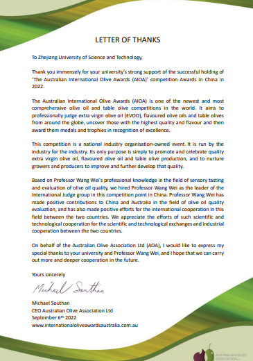 王伟研究员介绍了此次大赛的基本情况,澳大利亚橄榄油协会主席Michael Southan先生在线上对我院承办此次比赛表示感谢,代表大赛组委会给我校专门发来感谢信,希望进一步加深双方学术交流合作。2022年澳大利亚国际橄榄油大赛由澳大利亚油橄榄协会(AOA)主办,于9月6日在全球范围内包括西班牙、意大利、中国、新西兰和澳大利亚等5个赛点同日举行。中国赛点的评审由浙江科技学院生化学院承办,中国裁判组由我院王伟研究员、浙江省农科院朱申龙研究员、张玉副研究员、李雪博士以及甘肃陇南市经济林研究院副院长邓煜研究员等5位专家组成,王伟研究员担任中国赛点主裁判员。我院对橄榄油品鉴感兴趣的老师进行了现场观摩学习,为我校新裁判员培养奠定基础。