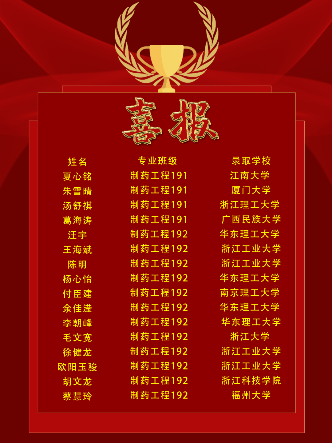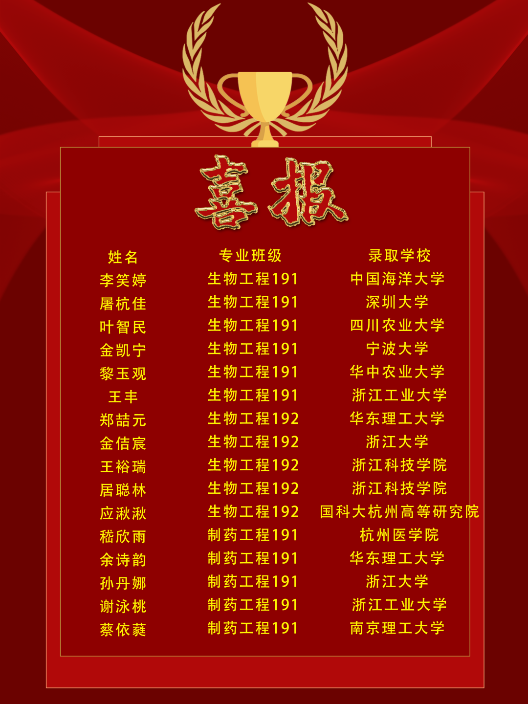 2023年生化学院285名毕业生,109名学子被国内外高校成功录取,录取率高达38.25%。顺利上岸的同学中,被浙江大学、华南理工大学、厦门大学等“985”高校录取10人,华东理工大学、上海大学、宁波大学等“211”“双一流”院校录取的人数共计40人,占录取比例的40%,对比去年上升11%。更是涌现了一些典型团队,其中制药工程专业考研录取率达46%,特优学风示范班制药192班达52%,学风领航团食品专业学生党支部高达73%,领航示范寝室7幢209寝室4人全员上岸,录取率100%。