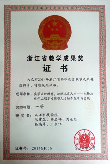 “实学实效教育,造就三实人才——生物与化学工程类应用型人才培养改革与实践”获浙江省人民政府第七届教学成果一等奖。