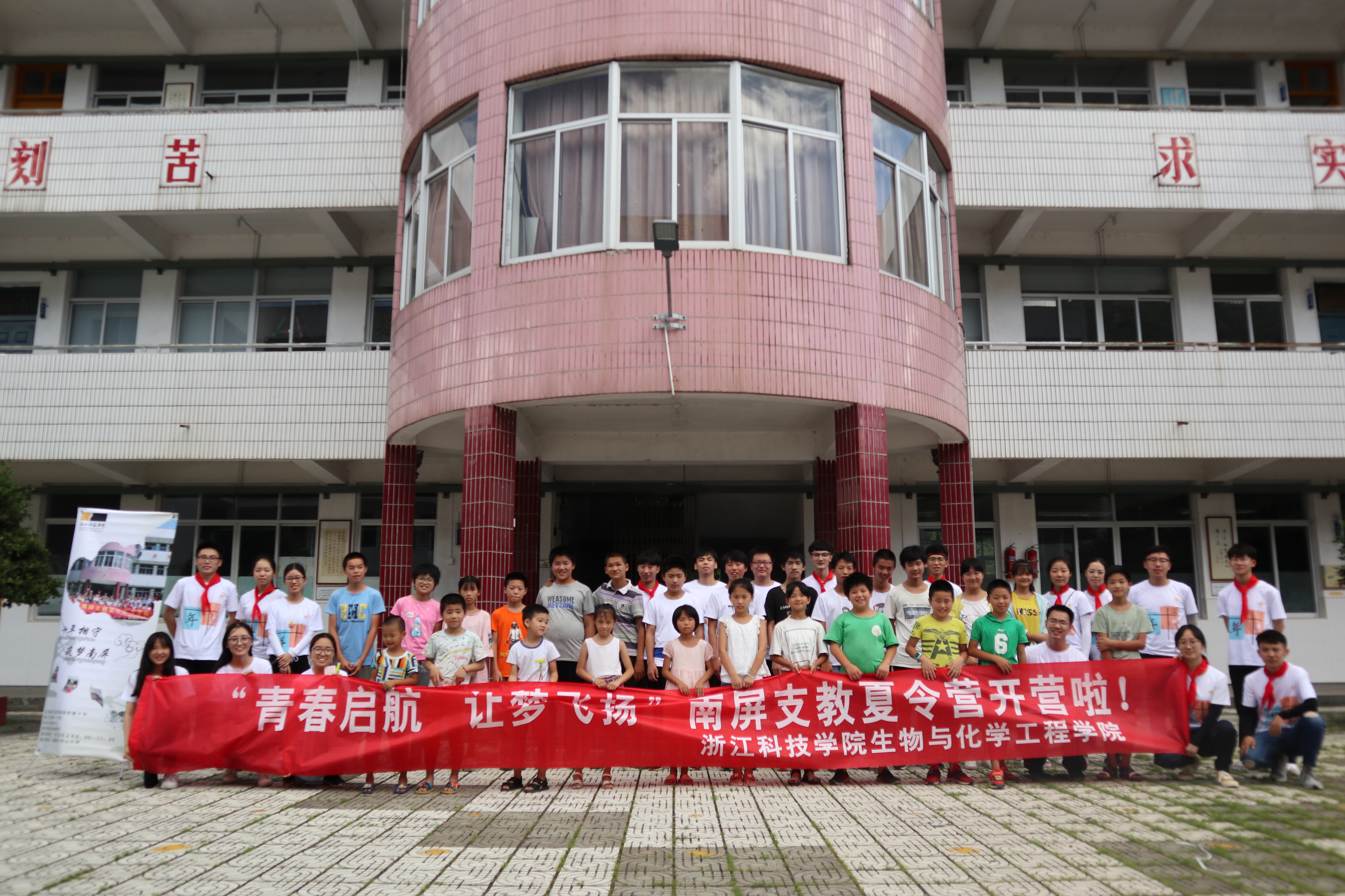 10点左右,全体夏令营老师们和同学们正式举行开营仪式,天台电视台的记者前来记录采访。同学们给老师们带上红领巾,之后大家一起举行庄重的升旗仪式,红旗飘飘,国歌声悠扬。