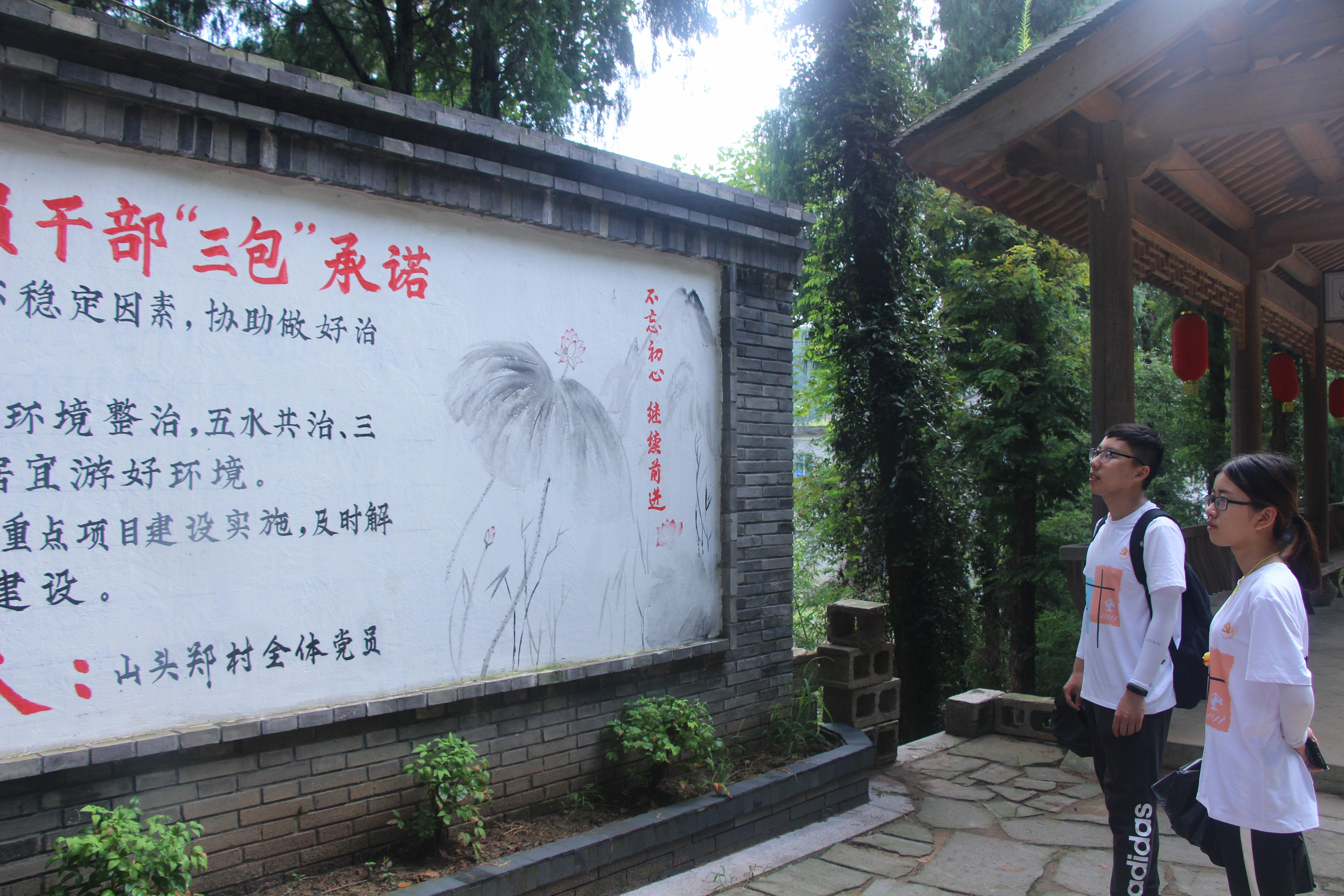 上午8:30,红色小分队准时出发,走访了前杨村、下杨村、山头郑、上杨村四座村落。队员们参观了初心讲堂廉政党建文化教育基地、党建文化长廊,交流了解南屏乡党建方面的工作,认真阅读优秀党员故事,感受中国共产党员实事求是的工作态度,求真务实的工作作风。沿着乡间小道,我们一路向上,沿途生动的红色墙绘吸引了队员们的目光,“千年古村,和合家园”是南屏乡现如今的美好状态;“红色传承,将军故里”是南屏乡对党建文化工作的传承和落实。正因为当地党建文化落实到位,南屏乡才有现在万象更新的面貌。